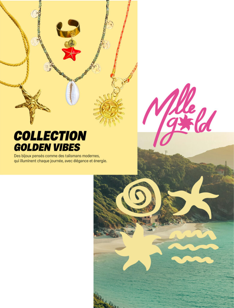 À travers mon projet MLLExGOLD, j’explore cette passion en imaginant et en sélectionnant des pièces fines, lumineuses et intemporelles, souvent portées près du cœur. Chaque bijou fait à la main raconte une histoire : celle de la confiance en soi, de l’audace discrète et des bonnes vibrations. J’aime travailler des formes symboliques : étoiles, soleils, coquillages, qui rappellent la nature, le voyage et l’été.